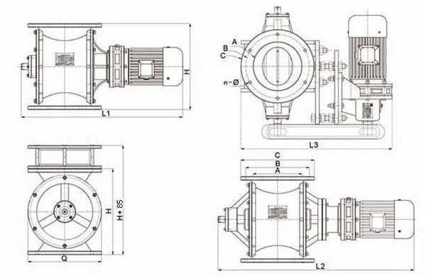 | 型號 | A | B | C | H | Q | L1 (內(nèi)) | L2 (外) | L3 (鏈) | n-Ф | 工作溫度 ℃ | 轉速 轉/分 | 電機功率KW |